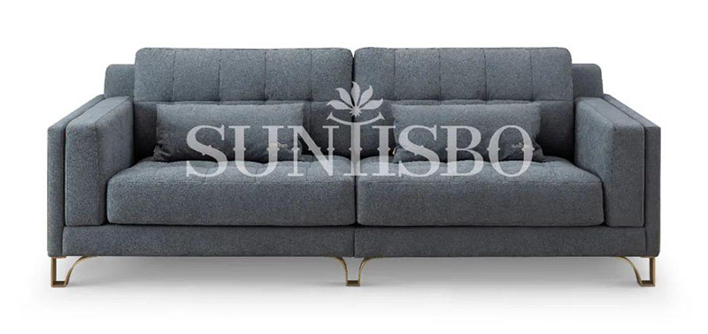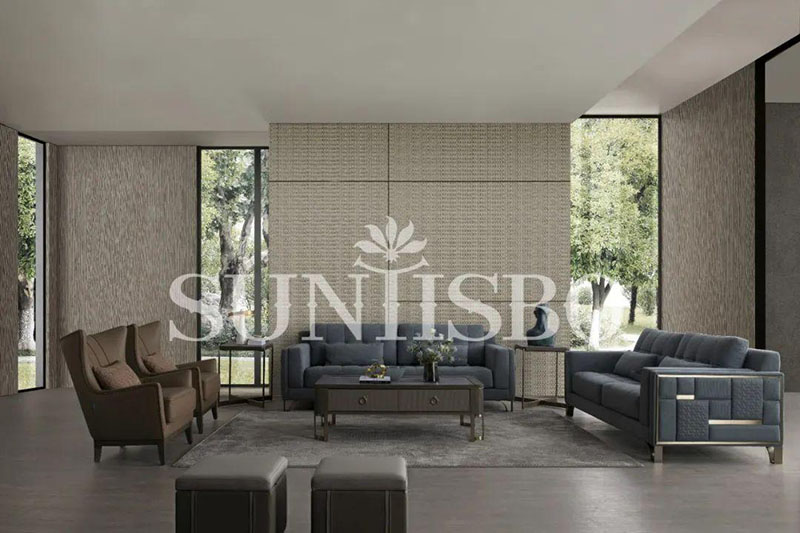 沙發(fā)采用細(xì)膩的顆粒感皮料,不僅增加了霧霾藍(lán)色彩的飽和度,也在視覺上充實了空間的安全感。輪廓,扶手皆為干練利落的直線,放眼望去不僅簡化了空間,也傳達(dá)著對精簡生活的追求。