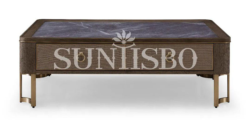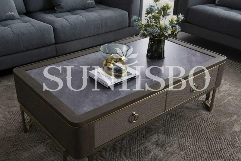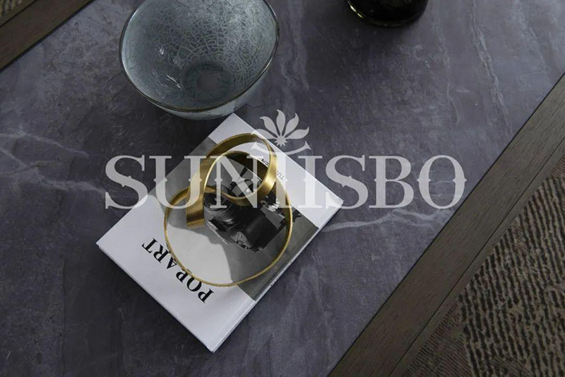 茶幾桌面采用仿巖板質(zhì)感的巖玻,既保留了鋼化玻璃的超強(qiáng)硬度,同時擁有玻璃的通透感與巖板紋理的現(xiàn)代感。玻璃與巖板產(chǎn)生的撞色,提升了空間的氣韻。
