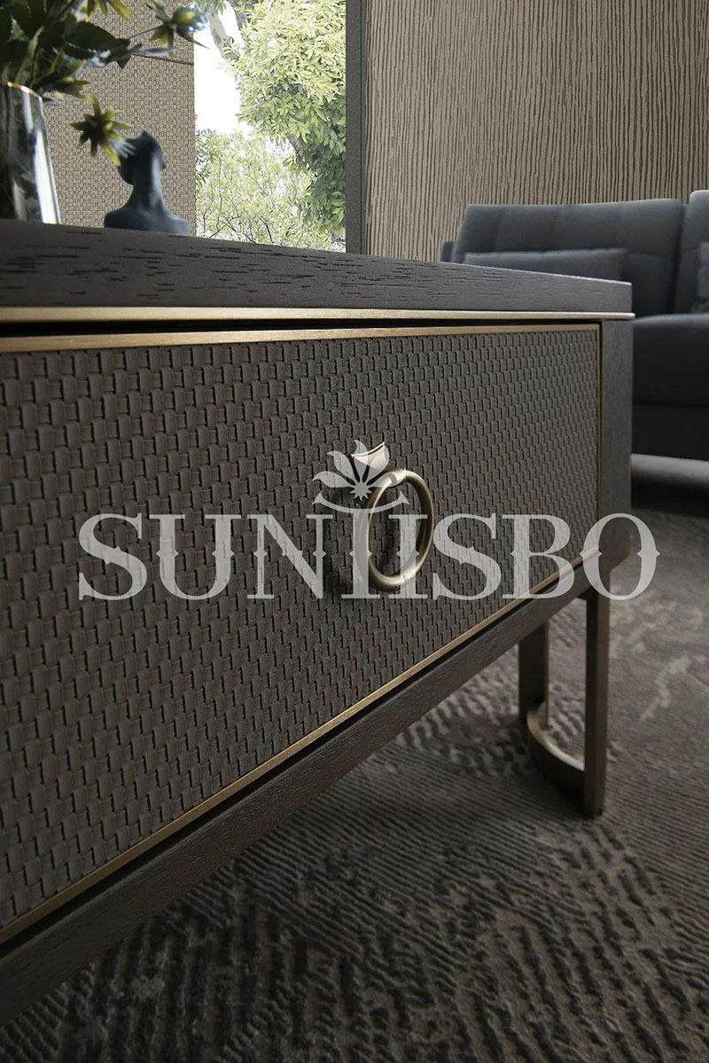 面板鑲嵌的編織紋皮質(zhì)在實木的基礎(chǔ)上進(jìn)行雕刻,輔以極佳的傳統(tǒng)編織藝術(shù),讓空間倍顯溫潤時尚感。