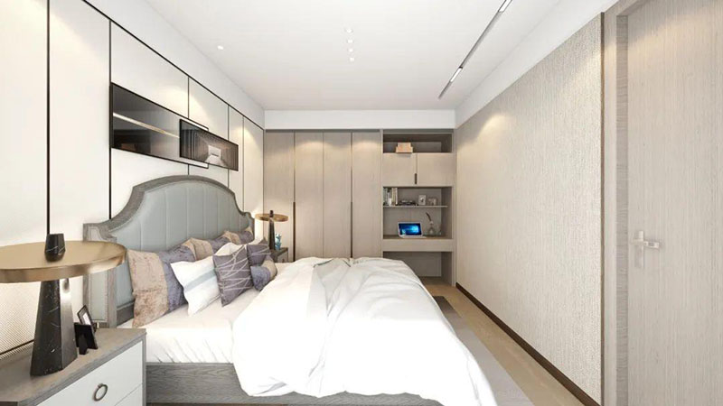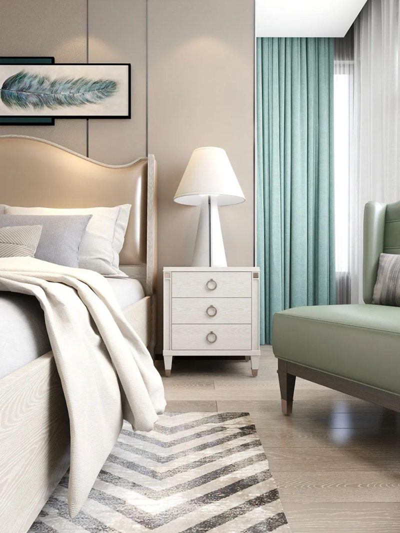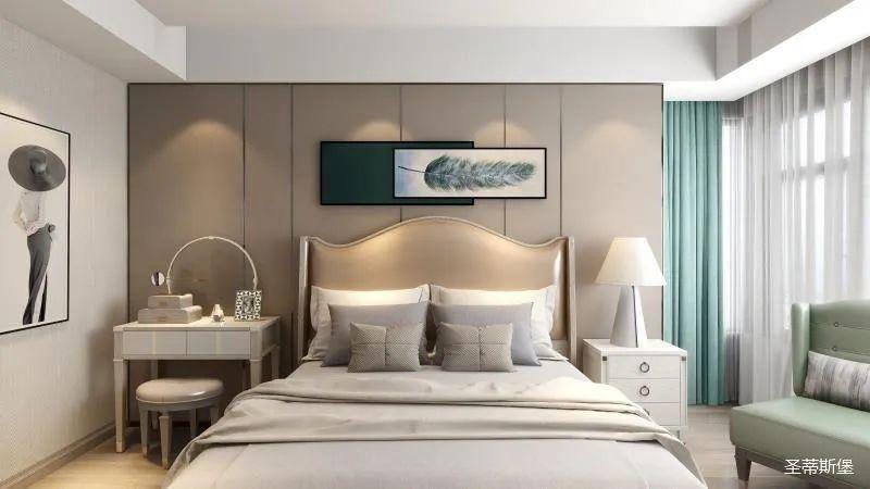 ▲次臥空間主要是以淺色為底調(diào),大面積的莫蘭迪色與淺色相平衡。極強(qiáng)線性裝飾畫帶來的延伸感讓視覺煥然一新。少許的金屬元素?cái)z入,瞬間提升了空間的精致度,將溫潤(rùn)雅致與時(shí)尚輕奢糅合在同一空間里,每一處都洋溢著浪漫的氣息。