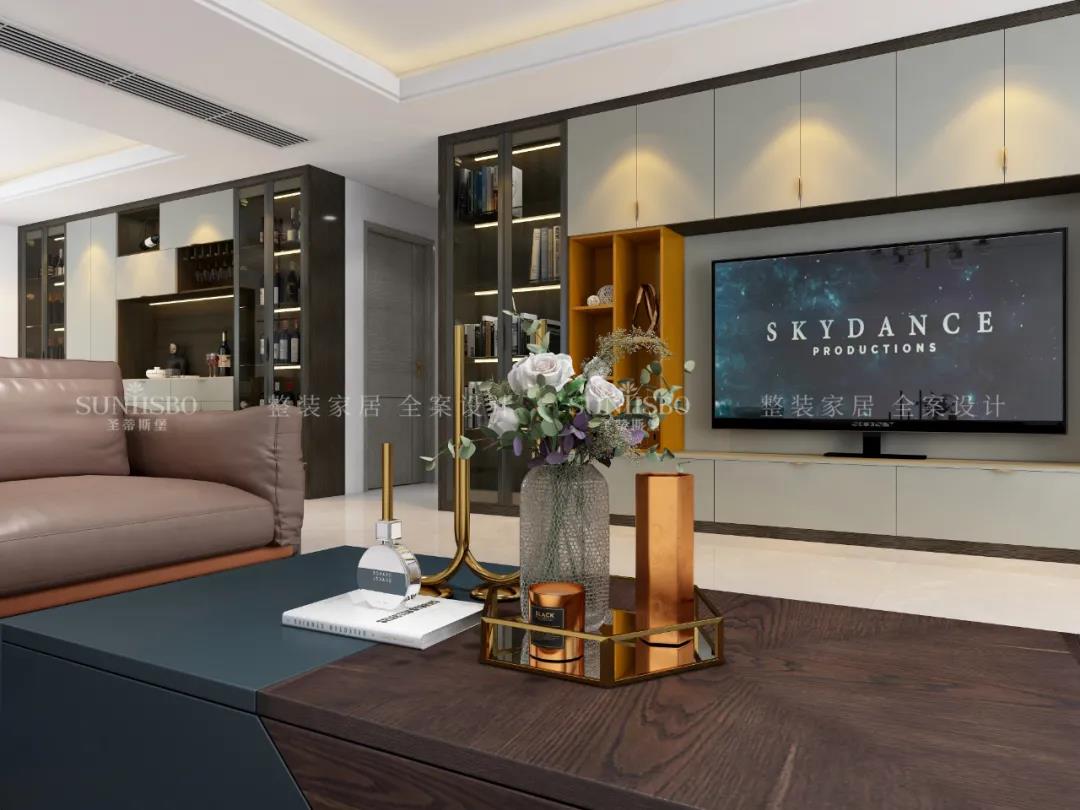 客廳一面置頂?shù)亩ㄖ乒?,大大增加了空間收納,也將電視背景墻的觀賞性發(fā)揮到極致。淺灰與明亮橙的“動靜”屬性,與沙發(fā)上的愛馬仕橙相呼應(yīng),從空間中漫溢出歡樂和跳動的樂章,回響生活中那一抹絢麗和精致,同時也擁有著對立且和諧的高級范兒。