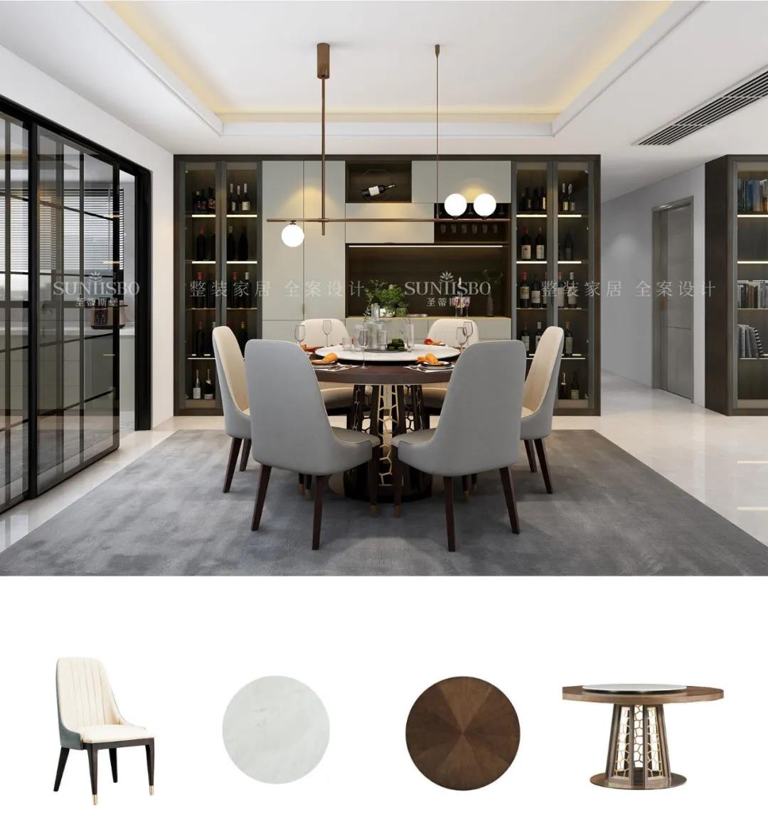 移步到餐廳空間,餐邊柜立面簡致,紋理細膩,展示區(qū)合理分配,增強了空間層次感,彰顯出飽滿的意式美感。實木柜面加以金屬拉手的裝飾,將極簡現(xiàn)代與高端質(zhì)感融合,以簡約的形式表達出“簡而不失其華”的感染力。