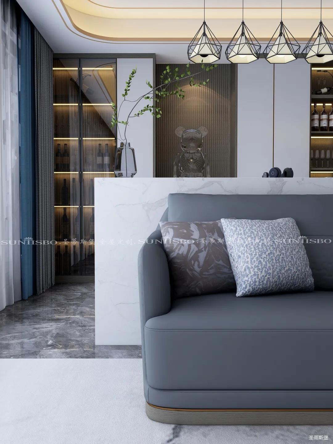 客廳風格當場敲定,入戶儲物玄關與客廳空間一體設計打破了傳統(tǒng)格局,延承了大平層的落地窗裝飾,軟裝窗簾三色搭配,低調(diào)又高級的霧霾藍延展了空間現(xiàn)代簡約的格調(diào)。