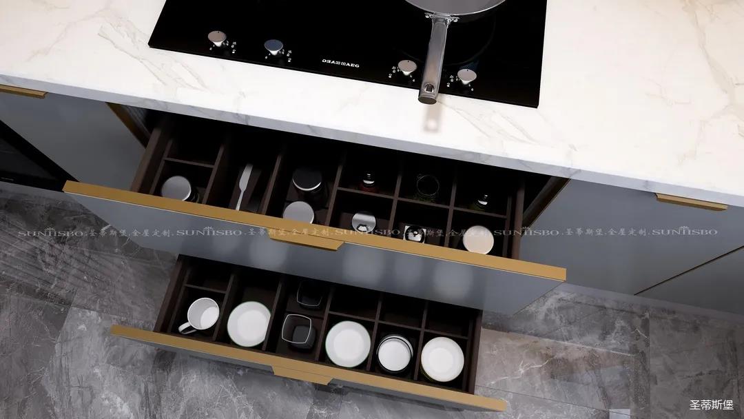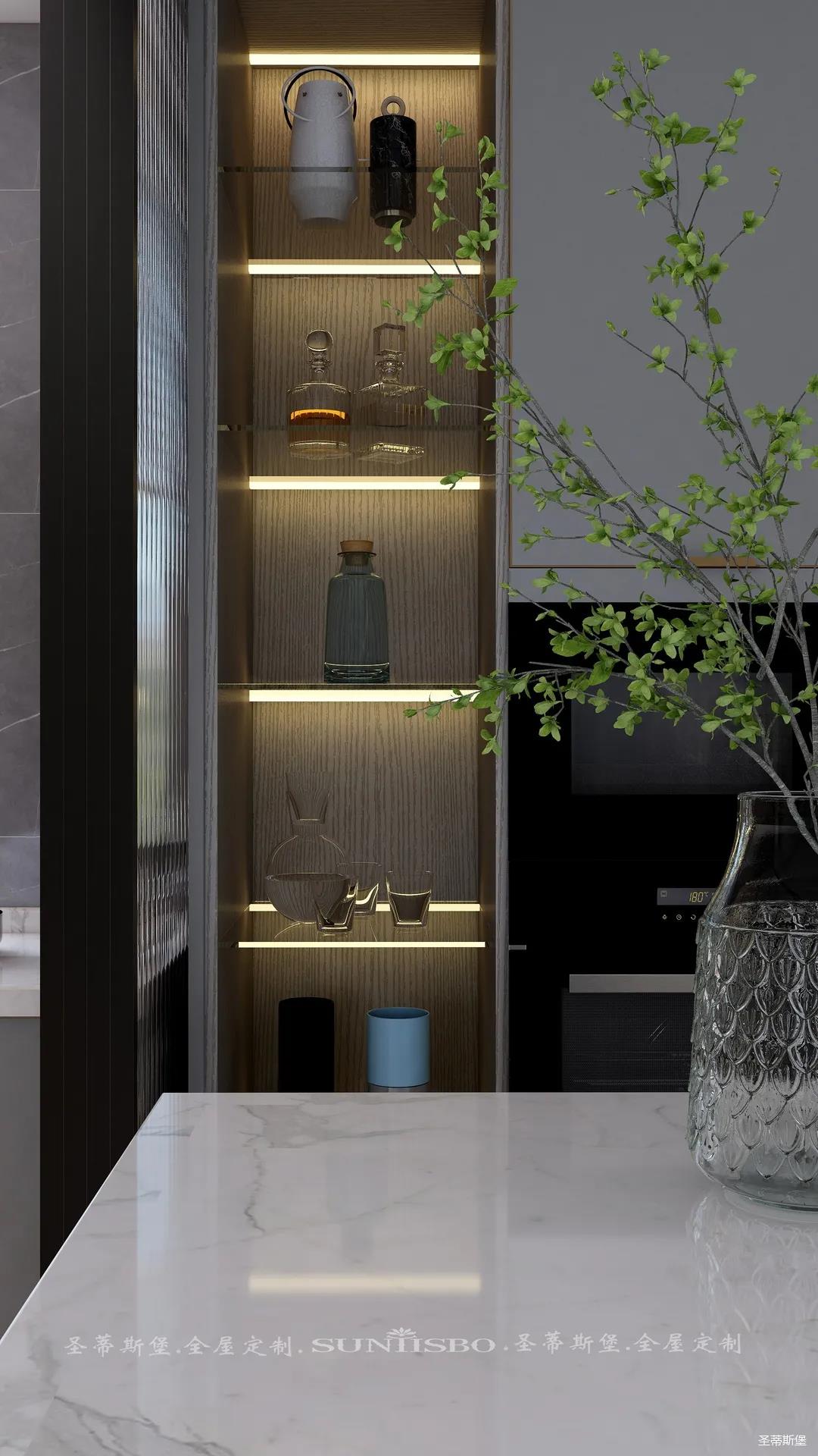 ▲英倫仿古灰的定制柜體在復古中給空間增添了一份高貴感。