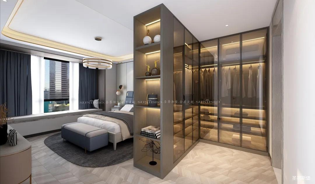 設計師不浪費每一寸空間,將主臥的大空間劃分出一個步入式的L型衣帽間,當即隔斷了進門對床的尷尬,滿足了我一直以來擁有獨立衣帽間的夢想,它不僅是個收納場所,更是臥室的質(zhì)感體現(xiàn)。