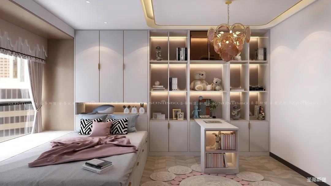 兒童房的主色調(diào)是白色,空間運用不同程度的粉色展現(xiàn)出一個充滿童真的空間氛圍,布偶小熊,別致的兒童擺件都是對女兒活動空間的精選,在燈光的渲染下,呈現(xiàn)出溫馨舒適的氛圍。