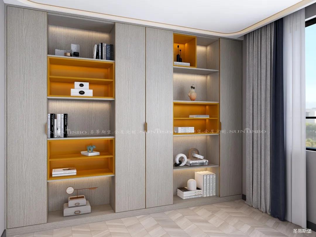 書柜點綴著適當?shù)膼垴R仕橙,除了自身攜帶的高貴氣質(zhì),在聚焦視線的同時,還明確了收納分區(qū)。