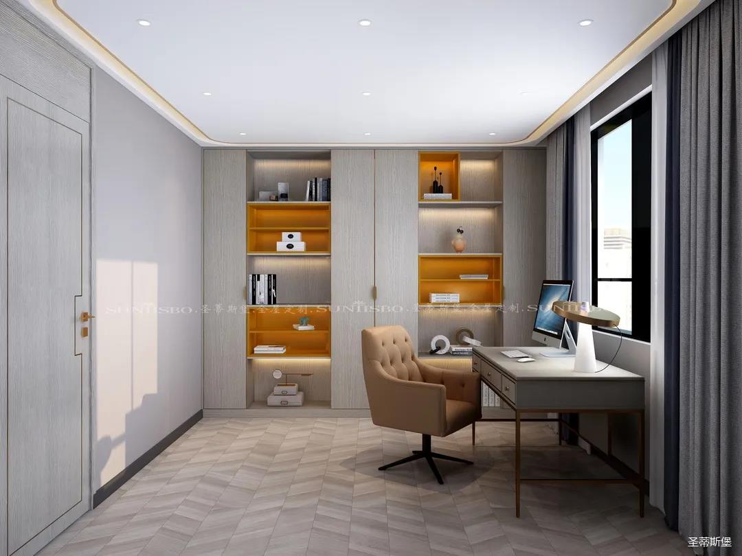 英倫仿古灰實木嵌墻書柜,結(jié)合同色系的時尚簡約書桌,整個空間都被自然氣息包圍。由于工作原因,加班也成為了生活中的常態(tài),簡約書房設計打破了平時忙碌的生活,也為心中尋得那一方心靜之地。