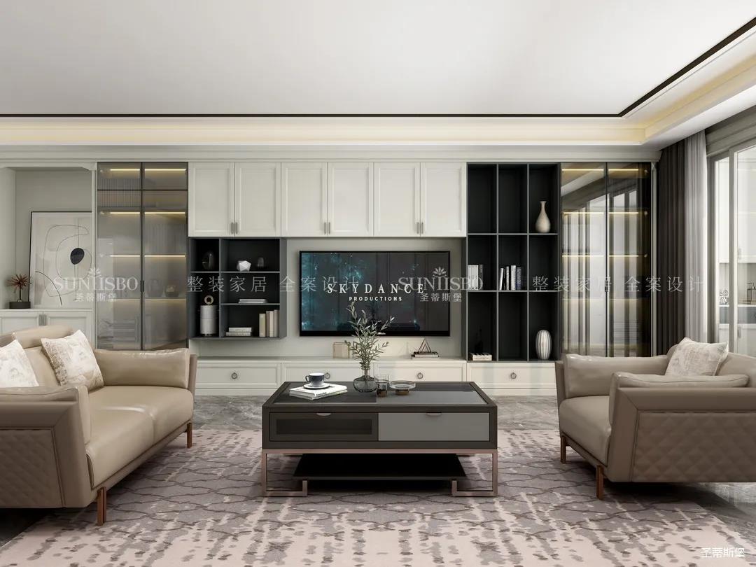 “七分藏三分漏”的設計理念是簡奢風格中應用最多的,運用隱藏式玻璃移門或拉門,可避免做全開方式收納導致的積灰、難清理等問題。玻璃材質(zhì)本身的特質(zhì)就是時尚的代表,而且具有極好的抗氧化性和防潮等功能,天然環(huán)保。其通透明亮的質(zhì)感,且無繁復裝飾,直接連接了空間整體性,賦予了空間自由舒適的寧靜感。