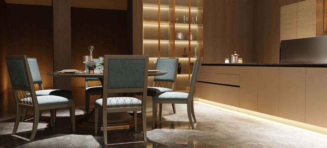餐廳空間納入了多重材料,金屬、石材、木飾的搭配呼應(yīng)著飽和度較高的軟裝,將都市的舒適感與藝術(shù)氣息融為一體。極簡(jiǎn)的單色線條美感在不同的材質(zhì)中形成明暗對(duì)比,開(kāi)放式的包容空間格局實(shí)現(xiàn)了隱藏收納和陳列外漏的雙重功能。暖系的層板燈搭配著獨(dú)具特色的烹飪空間,營(yíng)造出具有儀式感的用餐體驗(yàn)。