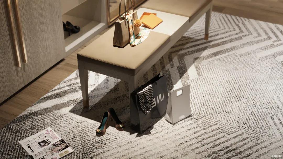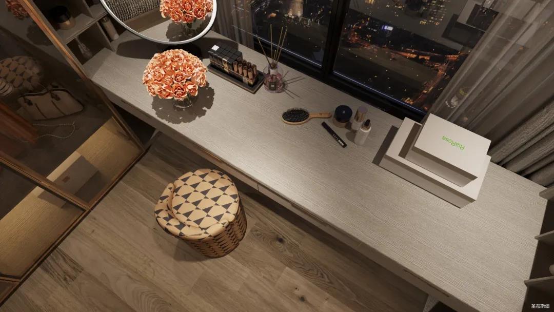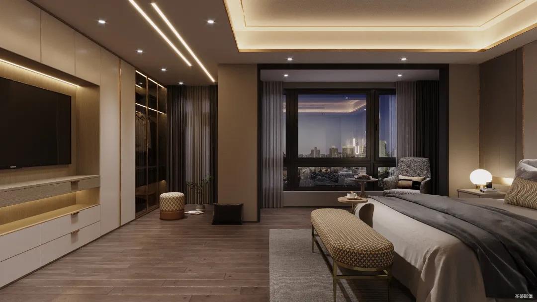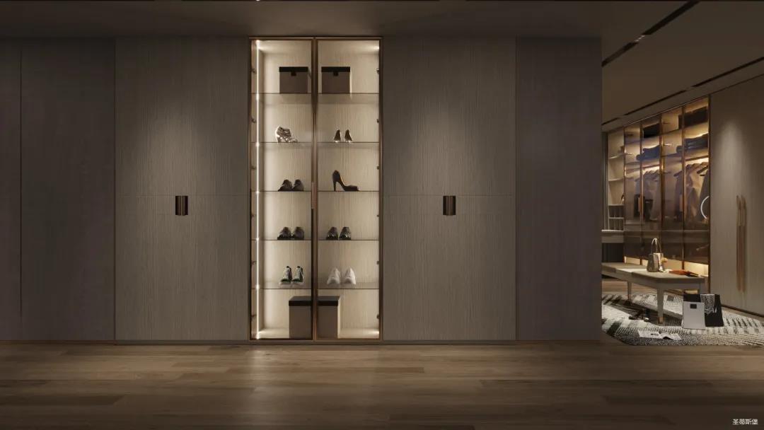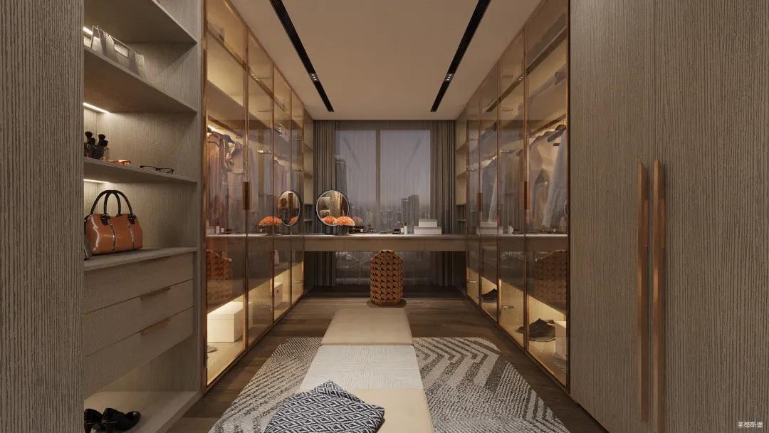移步衣帽間,精簡(jiǎn)華麗幾乎貫穿了整個(gè)空間,質(zhì)感高級(jí)的實(shí)木定制柜框架、通透明亮的玻璃展示區(qū)、色調(diào)醇厚的金屬鑲邊,每一項(xiàng)細(xì)節(jié)搭配都在強(qiáng)調(diào)著業(yè)主的高端品位。妝臺(tái)前的落地窗讓我們?cè)谟^賞都市繁華的同時(shí)也屏蔽了都市喧囂,讓我們置身于繁華都市中有一處寧?kù)o休憩地。