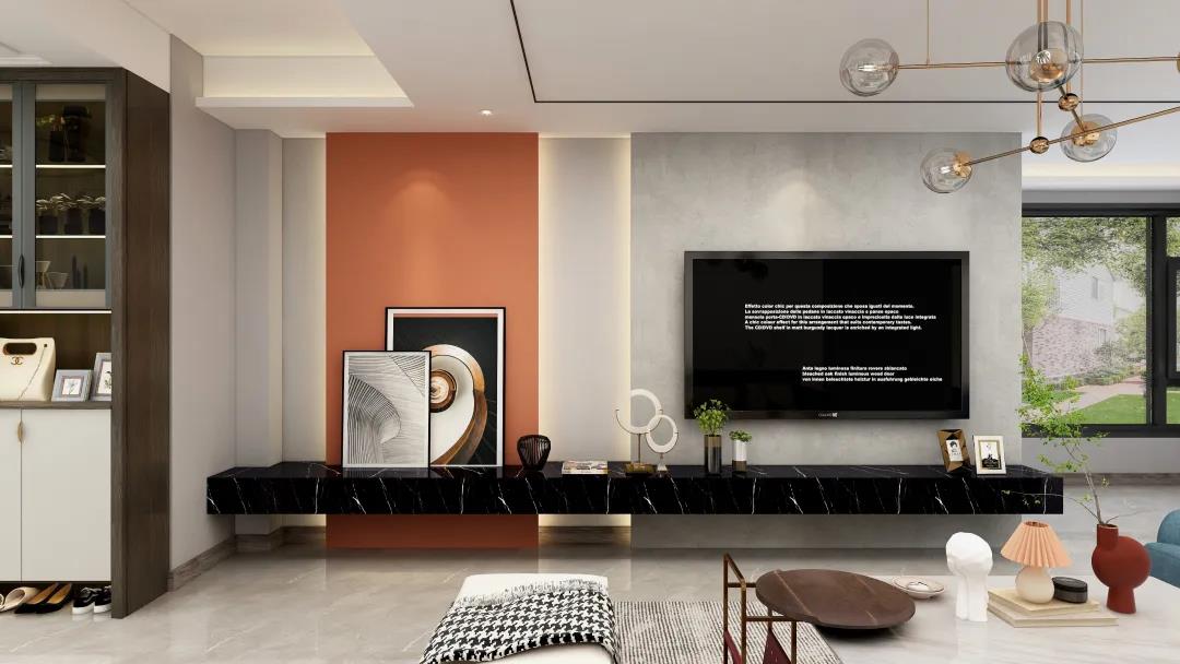 窗外的陽光使得客廳空間更加明亮寬敞。電視墻精致的線條設(shè)計(jì),令空間更具層次感。亮眼的愛馬仕橙,搭配個性的抽象掛畫又讓整個墻面更加豐富?;盍εc沉穩(wěn)融合,給平凡而枯燥的生活增添些許希望與美好。