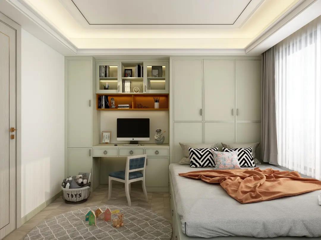 次臥背景墻兩端是對稱式設(shè)計(jì),以淡雅的暖色為主,
