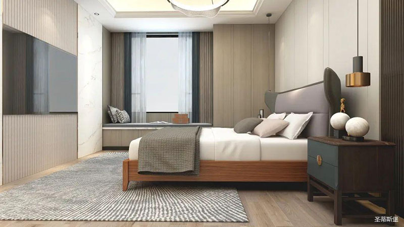 臥室精簡有致,從質(zhì)感出發(fā),打造由內(nèi)而外的優(yōu)雅奢華感。背景墻、地板、地毯均擁有較強的肌理感,在加上金屬軟裝飾物調(diào)和,讓空間在低調(diào)內(nèi)斂的基礎(chǔ)上又不失時尚的高級感,飄窗進階為溫馨的一角,閑暇時,則可倚窗而坐,品一杯紅酒,感受生活中的愜意時光。