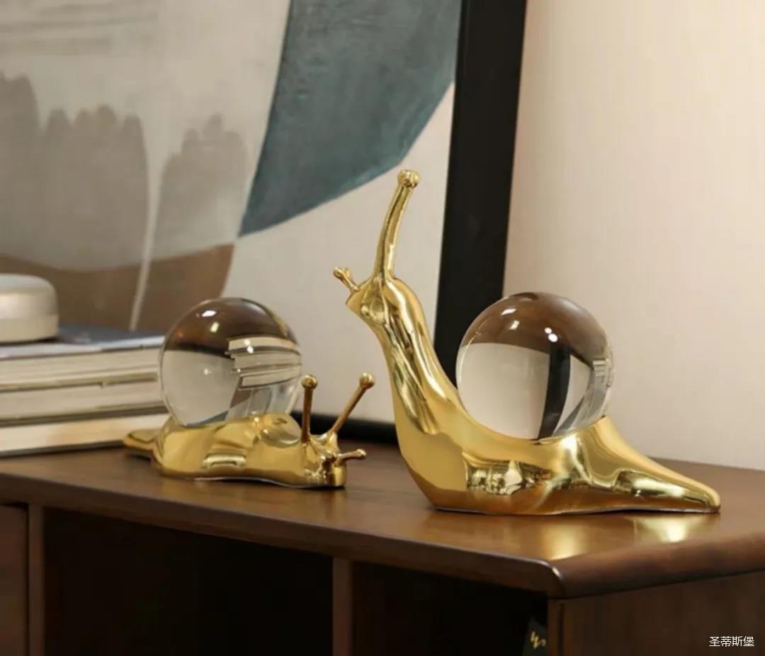 在黃銅材質(zhì)上勾勒出蝸牛流暢的肌肉線條,描摹蝸牛攀爬蠕動與站立眺望的姿態(tài),加上觸須伸縮,豐富而逼真的細節(jié)制作,生動有趣。