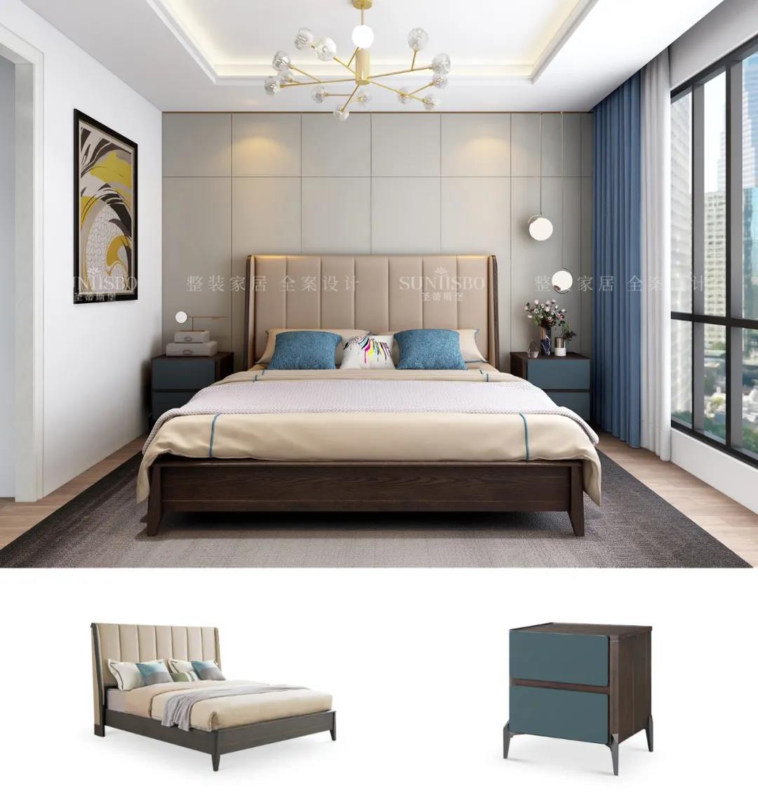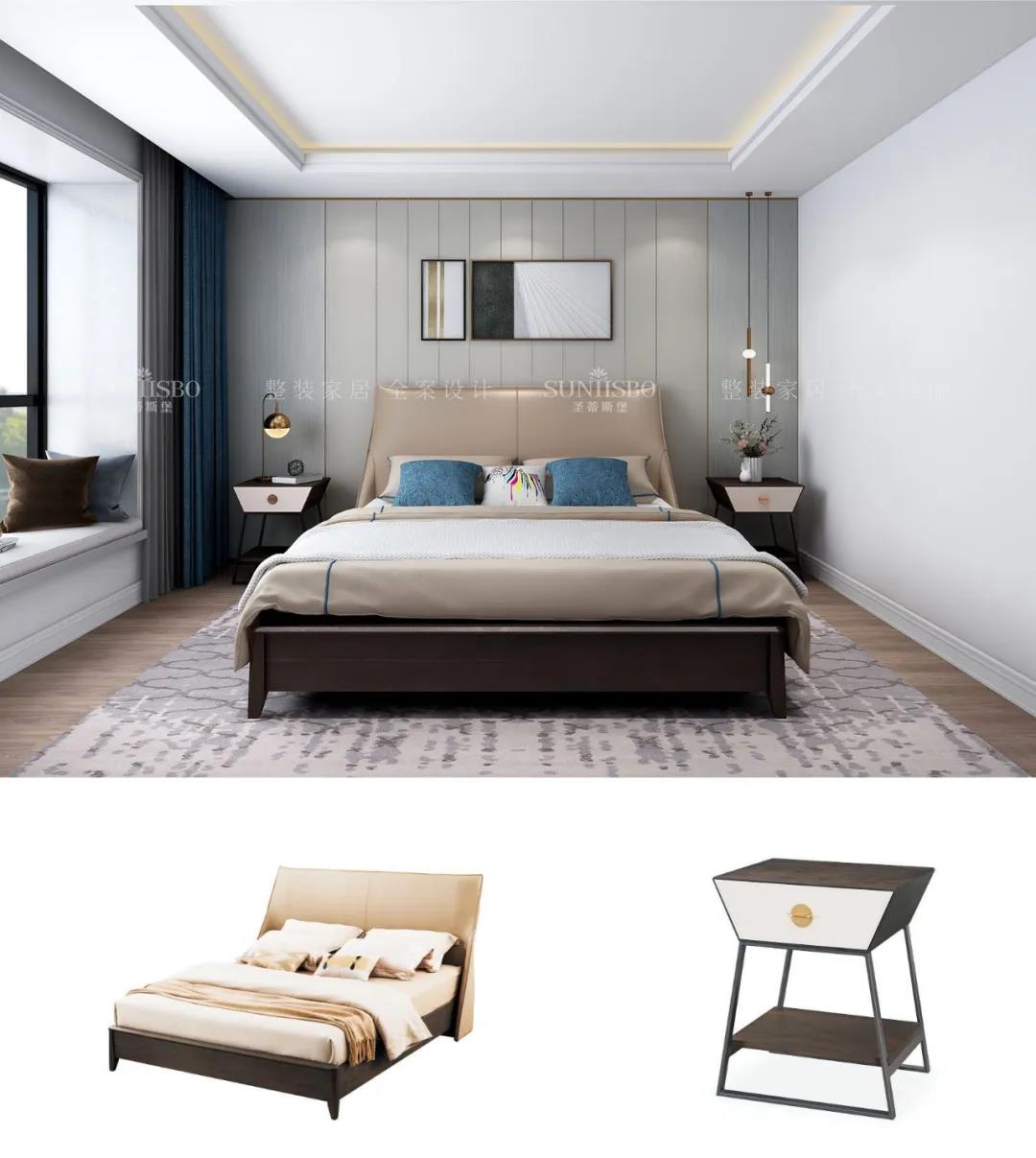 設(shè)計師運用最為百搭淺灰實木護墻板打造主臥空間,簡約的線條縱橫交錯,帶來了干凈、清爽、舒適的視覺效果。明暗分區(qū)的衣柜在燈光的渲染下,虛實光影變換其中,為每個角落氤氳出浪漫的氣息。