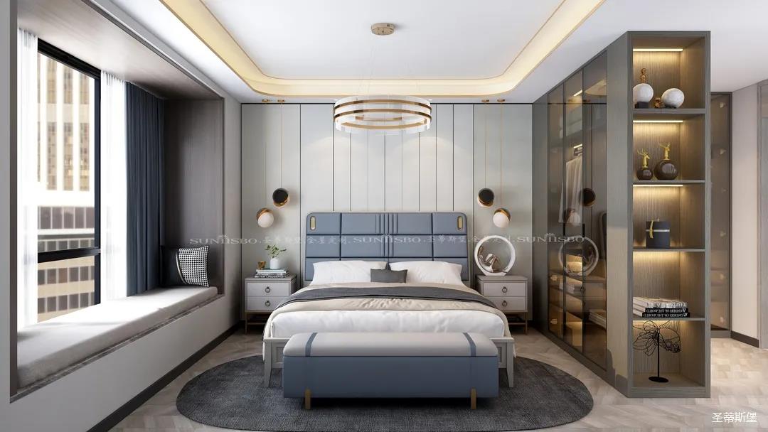 臥室的設計繼續(xù)延續(xù)著空間的高級灰,藍灰色彩的對比,讓主臥空間層次感更加豐富,充足的陽光隨意散落,空間更加溫暖大氣,對稱的球形吊燈設計,恍如兩個“快樂星球”,展現(xiàn)著空間應有的藝術(shù)性,設計師巧妙地設計,營造出與眾不同的生活品質(zhì)。
