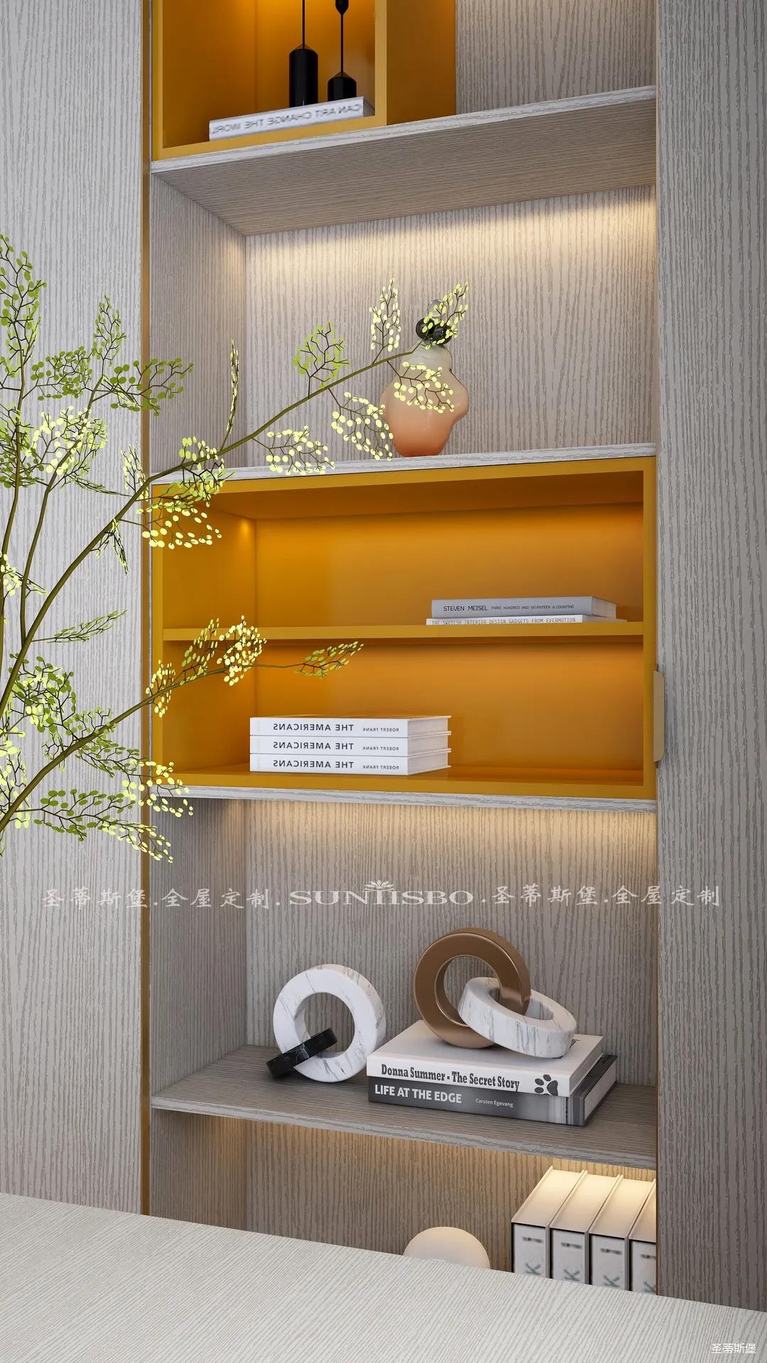 書柜點綴著適當?shù)膼垴R仕橙,除了自身攜帶的高貴氣質(zhì),在聚焦視線的同時,還明確了收納分區(qū)。