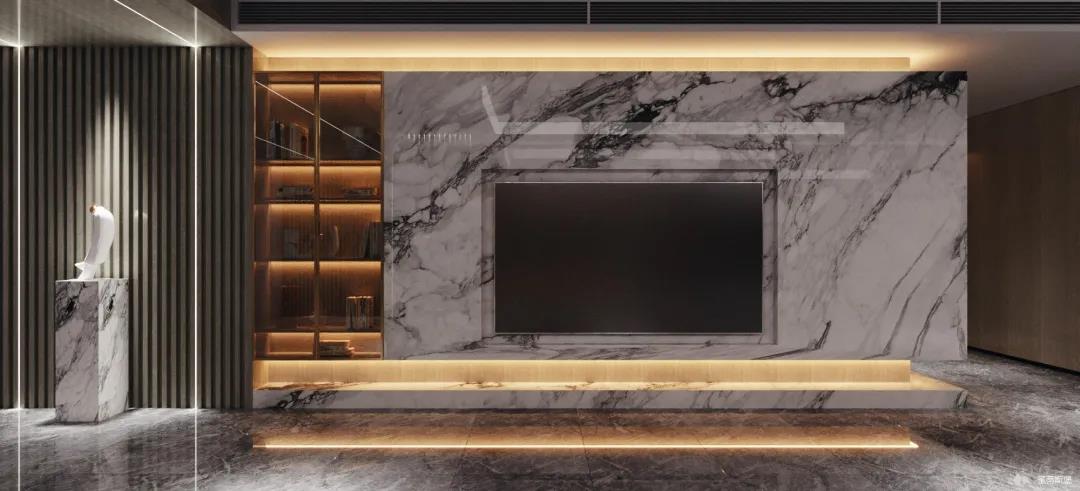 為了減輕現(xiàn)代都市工作的忙碌,客廳設(shè)計(jì)更偏向于對(duì)生活“解壓”的極簡(jiǎn),精選自然紋理的大理石與實(shí)木定制柜做一體化設(shè)計(jì),并在電視背景墻下半部分做挑空設(shè)計(jì),安裝個(gè)性十足的線性燈帶,延伸客廳視覺(jué)深度。