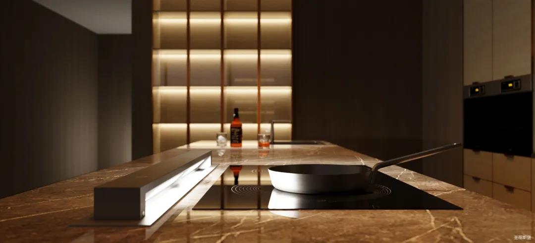 餐廳空間納入了多重材料,金屬、石材、木飾的搭配呼應(yīng)著飽和度較高的軟裝,將都市的舒適感與藝術(shù)氣息融為一體。極簡(jiǎn)的單色線條美感在不同的材質(zhì)中形成明暗對(duì)比,開(kāi)放式的包容空間格局實(shí)現(xiàn)了隱藏收納和陳列外漏的雙重功能。暖系的層板燈搭配著獨(dú)具特色的烹飪空間,營(yíng)造出具有儀式感的用餐體驗(yàn)。