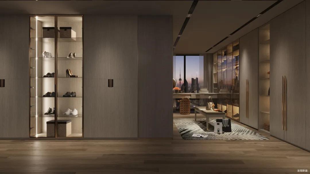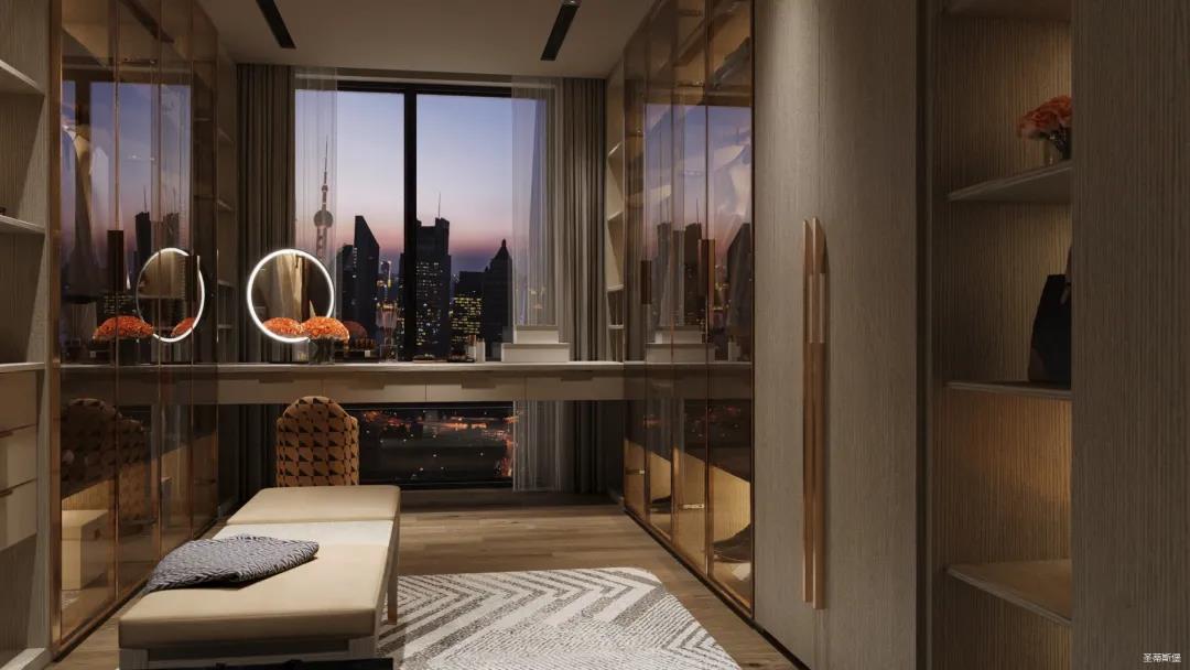 移步衣帽間,精簡(jiǎn)華麗幾乎貫穿了整個(gè)空間,質(zhì)感高級(jí)的實(shí)木定制柜框架、通透明亮的玻璃展示區(qū)、色調(diào)醇厚的金屬鑲邊,每一項(xiàng)細(xì)節(jié)搭配都在強(qiáng)調(diào)著業(yè)主的高端品位。妝臺(tái)前的落地窗讓我們?cè)谟^賞都市繁華的同時(shí)也屏蔽了都市喧囂,讓我們置身于繁華都市中有一處寧?kù)o休憩地。