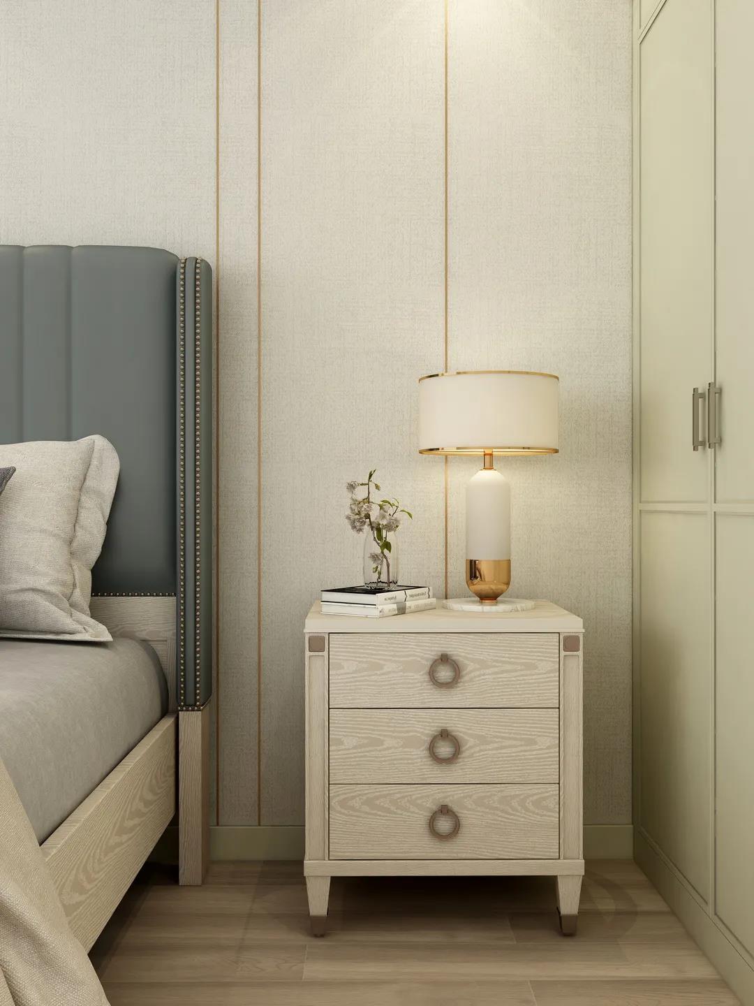 次臥背景墻兩端是對稱式設(shè)計(jì),以淡雅的暖色為主,